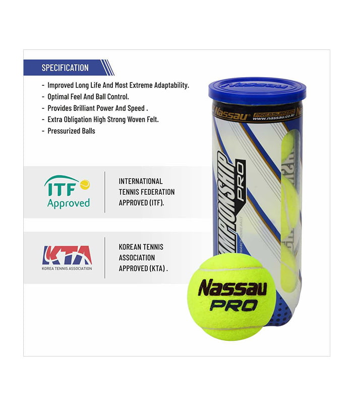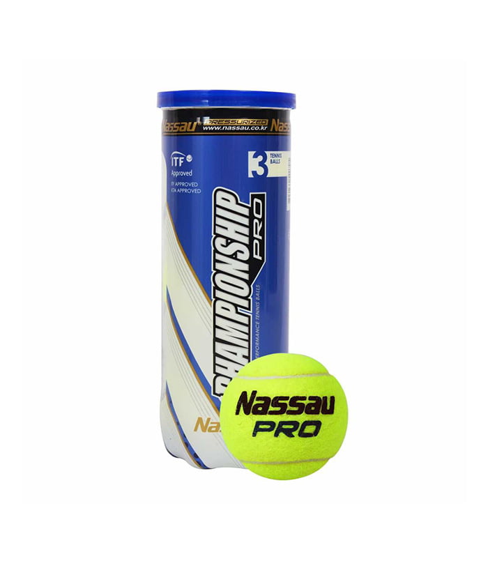 قوطی سه‌تایی توپ تنیس ناسائو مدل CHAMPIONSHIP PRO با استفاده از نمد باکیفیت تولید شده که نتیجه آن، توپ‌هایی با دوام، انعطاف‌پذیری بالا و عمر طولانی است. شرکت Nassau که در سال 1971 تأسیس شده، بیش از ۴۵ سال سابقه‌ در تولید تجهیزات تنیس دارد و یکی از برندهای معتبر در این حوزه محسوب می‌شود.